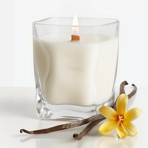 ELEMENT-TERRE, Bougie Parfumée en verre décoratif ondulé, grand format (300ml) avec Mèche en Bois crépitante, 55 heures de combustion (VANILLE EN FLEUR)