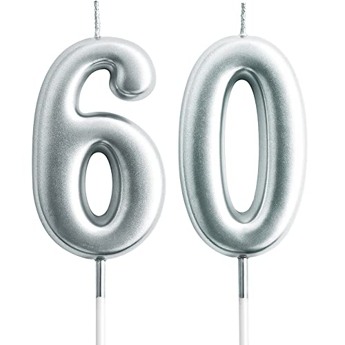 eusbon Bougie 60e pour décoration de gâteau, bougie d'anniversaire en forme de chiffre 60 pour fête d'anniversaire, anniversaire de mariage, 7 cm, grandes bougies en forme de chiffre argenté