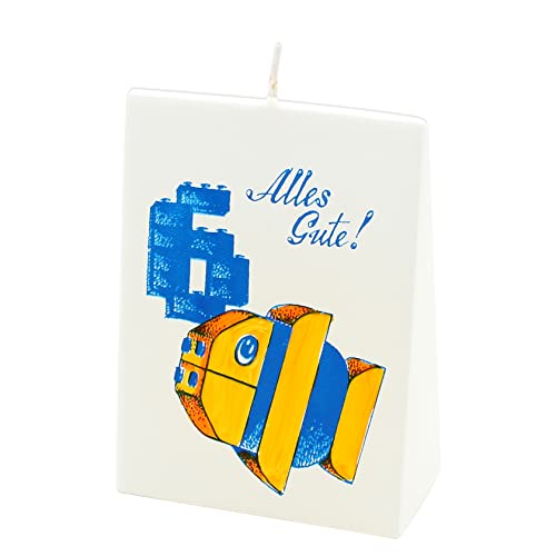 Dekohelden24 Bougie d'anniversaire de qualité supérieure pour 6ème anniversaire Motif poisson en pierre de construction faite à la main et peinte à la main 9 x 5 x 12 cm