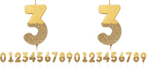 Bougie d'anniversaire numéro 3 dorée avec paillettes | Décoration de gâteau de qualité supérieure | Jolie, scintillante pour enfants, adultes, 3e, 13e, 30e fête, anniversaire, âge jalon (Lot de 2)