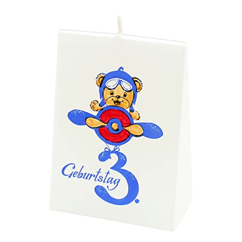 Dekohelden24 Bougie d'anniversaire 3ème anniversaire de haute qualité faite à la main et peinte à la main Motif ours en avion 9 x 5 x 12 cm