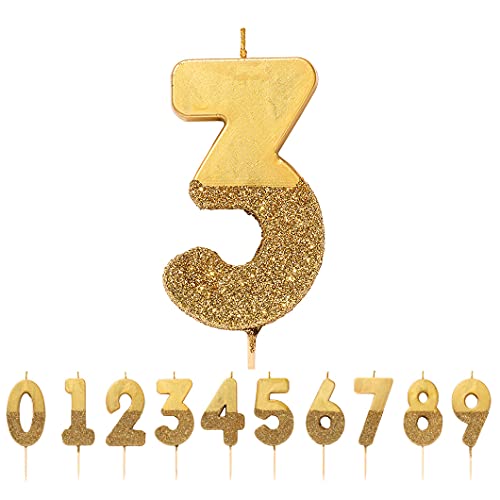 Grande Bougie 10CM, Bougie chiffre d'anniversaire Numéro, OR paillettée forme 3D, Décoration Gateau Anniversaire,Bougies Gâteau Marriage (OR, 3)