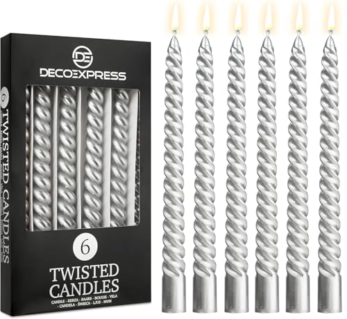 DECO EXPRESS Bougies Torsadées Lot de 6, Anti-Gouttes et Sans Parfum, Bougie Longue Durée 6h, Saint Valentin et Fetes des Mères Decoration Maison, Idee Cadeau (Argenté, Lot de 6)