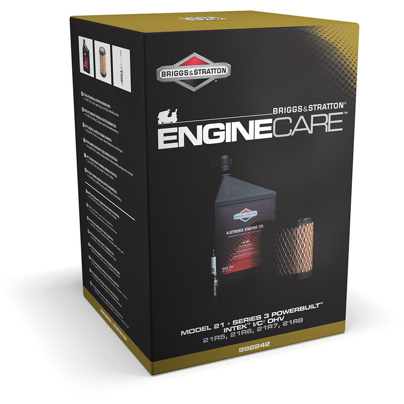 Kit d'entretien pour autoportées Série 3, modèle 21 briggs & stratton. Composé d'un bidon d'huile de 1,4 l SAE30, d'un filtre à air et d'une bougie.