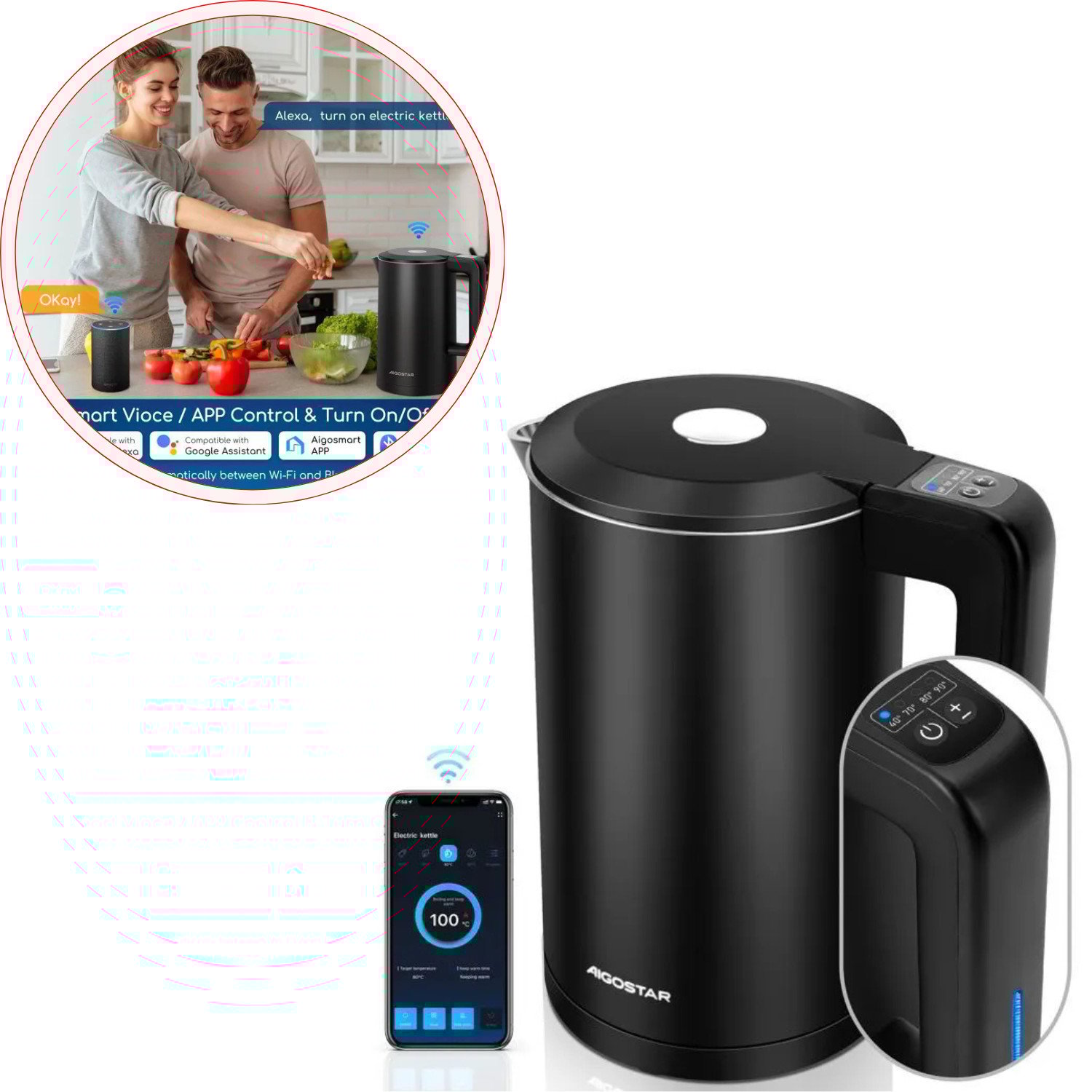 Aigostar Bouilloire Électrique Intelligente 1.7L Cool Touch température réglable Alexa et Google Home Maintien Chaud Jusquà 24H