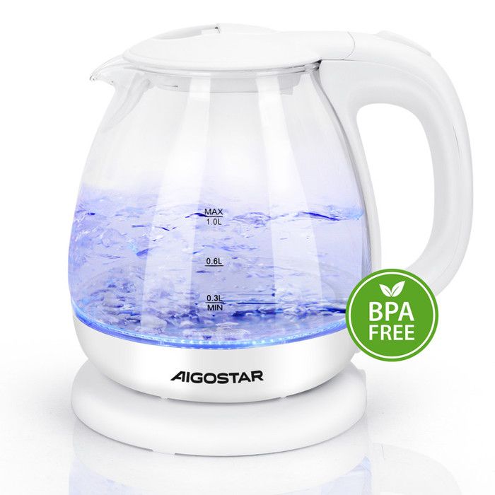 Aigostar Bouilloire électrique Mini Bouilloire en Verre borosilicaté avec illumination LED. 2200W capacité de 1L sans BPABlanc