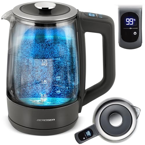 Berdsen Bouilloire avec réglage de la température, verre borosilicate, 1,7 l, fonction maintien au chaud, écran tactile, affichage de la température, éclairage intérieur gris