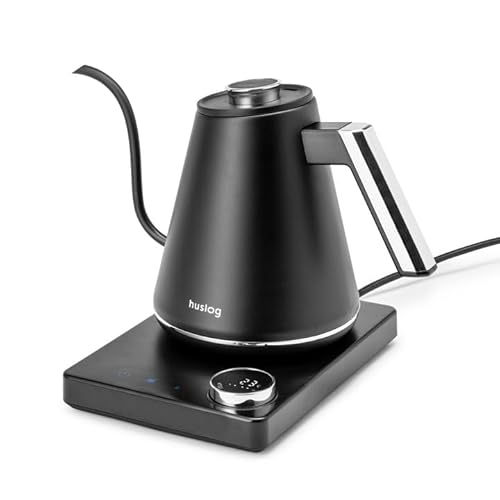 huslog Bouilloire Électrique 1L Température Réglable 40-100°C, Col de Cygne 8 mm, Écran LED, Fonction Maintien au Chaud, 1100W, Acier Inoxydable 304, Noir-Argent, Base avec Range-Câble