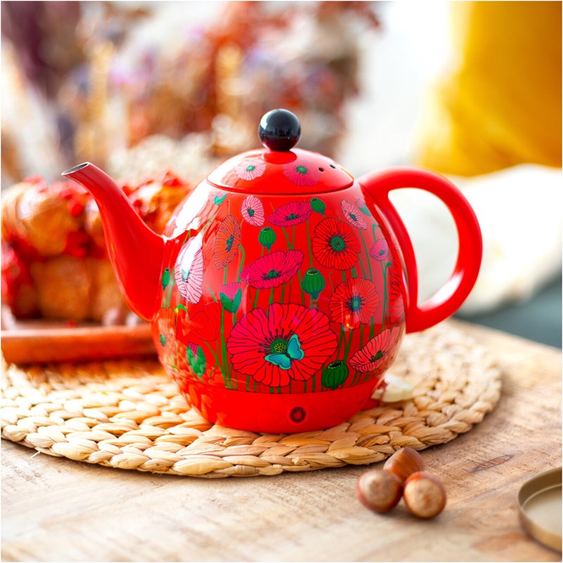 Bouilloire en Céramique Bouilloire Électrique sans Fil 1 Litre, Rétro Rouge Bleu avec Imprimés, Design Oriental,1000W Ebullition Rapide,sans BPA Auto-Arrêt & Protection Anti-Ébullition à Sec (A:Red)