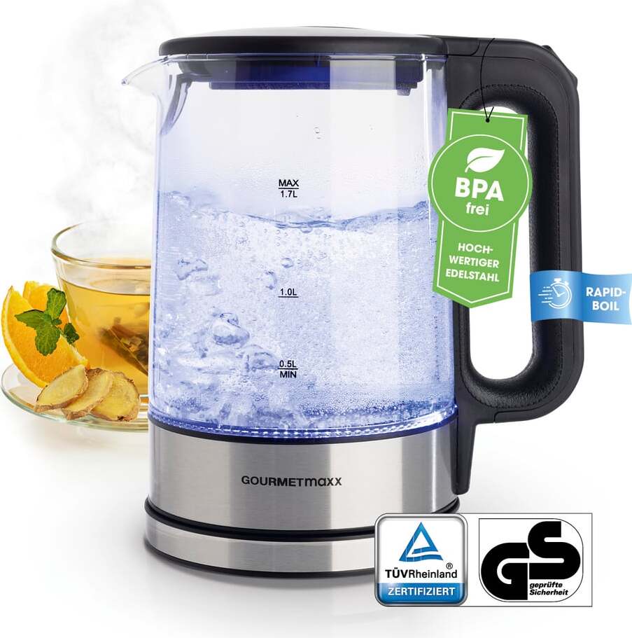 GOURMETmaxx Bouilloire en verre LED 1,7l - Inox/noir