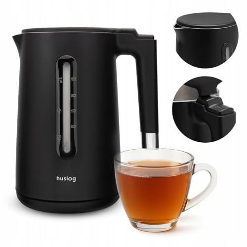 huslog Bouilloire Électrique 1,5L 2200W Double Paroi Cool Touch, Acier Inoxydable 304, Sans BPA, Indicateur de Niveau d’Eau, Base 360°, Protection contre la Marche à Sec, Noire
