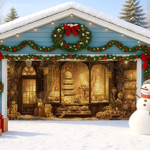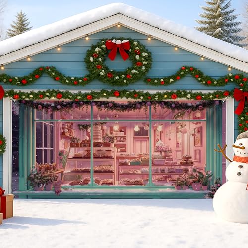 Housse de porte de garage Winter Wonderland, scène de boulangerie festive, grandes décorations de porte de garage, décoration de Noël intérieure et extérieure pour fête de Noël, 397 x 180 cm