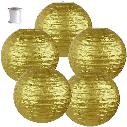 Surwin 5pcs Lanternes Papier Chinois, Lanternes en Papier à Suspendues, Boule Ronde Abat-Jour, Lanterne Decorative pour Intérieurs Extérieurs Mariages Fêtes et Événements (Or,12 Pouces)