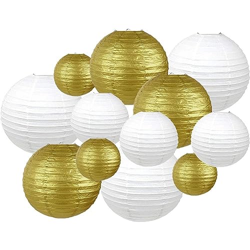 Surwin 12pcs Lanternes Papier Chinois, Lanternes en Papier à Suspendues, Boule Ronde Abat-Jour, Lanterne Decorative pour Intérieurs Extérieurs Mariages Fêtes et Événements (Blanc/Or)