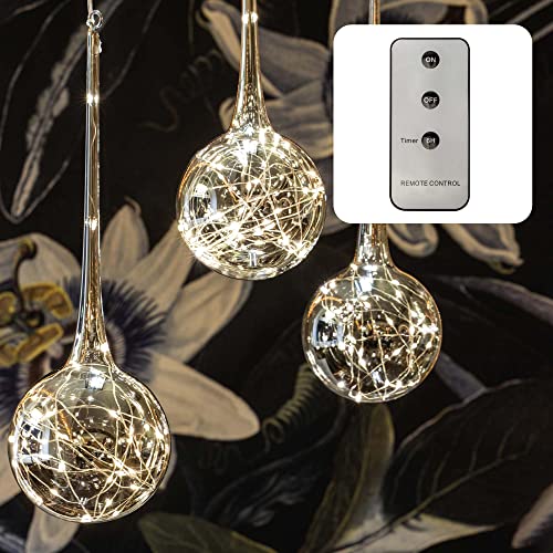 Hellum Boule de cristal LED suspendue avec guirlande lumineuse avec minuterie et télécommande, lot de 3 boules de cristal < 59 lm, avec 3 x 30 LED lumière blanche chaude, boule de cristal gris fumé,