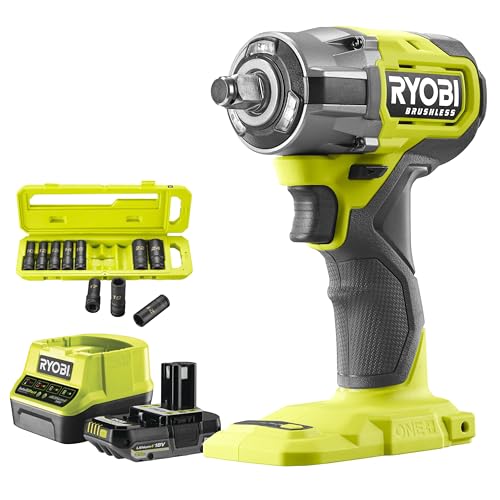 RYOBI - Boulonneuse à chocs 18 Volts ONE+, BRUSHLESS + 1 Batterie 2Ah & Chargeur + 10 douilles 1/2" (17, 19, 21 mm)
