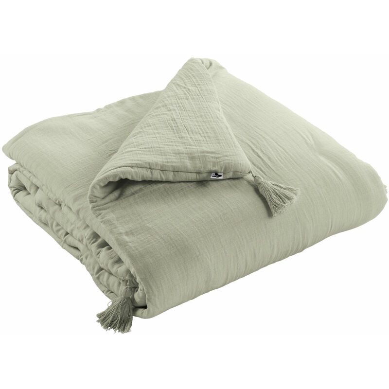 Édredon bout de lit en double gaze de coton 90x200 cm – Coloris vert d'eau – Finition pompons – 125 gr/m² – L'Effet Papillon