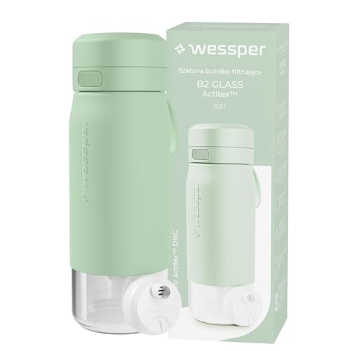 Wessper Bouteille d'eau filtrante en verre 500 ml, bouteille avec filtre Actitex Disc, réduit le chlore, compteur de changement de filtre, sans BPA, menthe
