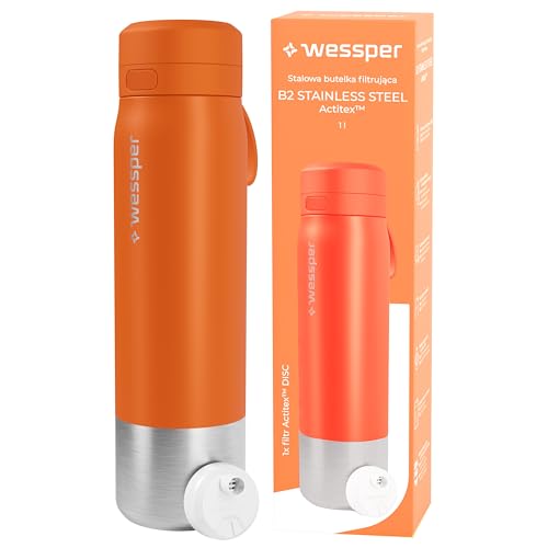 Wessper Gourde Filtrante, Bouteille d'eau en Acier Inoxydable avec Filtre Actitex Disc, 1 l, Filtre a Eau à Charbon, Réduit le Chlore, BPA FREE -Orange