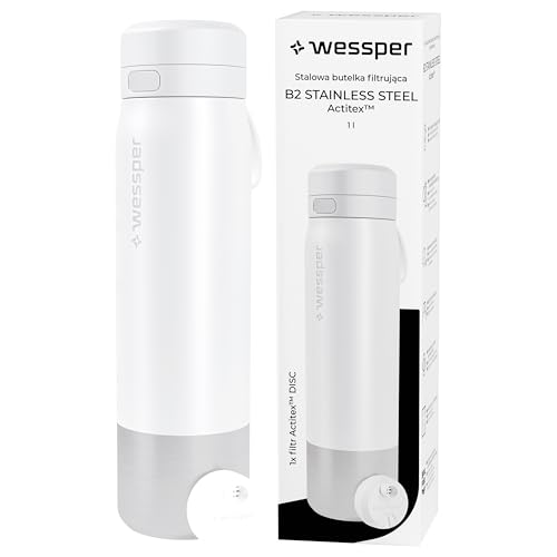 Wessper Gourde Filtrante, Bouteille d'eau en Acier Inoxydable avec Filtre Actitex Disc, 1 l, Filtre a Eau à Charbon, Réduit le Chlore, BPA FREE - Blanc