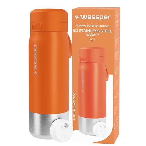Wessper Gourde Filtrante, Bouteille d'eau en Acier Inoxydable avec Filtre Actitex Disc, 700 ml, Filtre a Eau à Charbon, Réduit le Chlore, BPA FREE - Orange