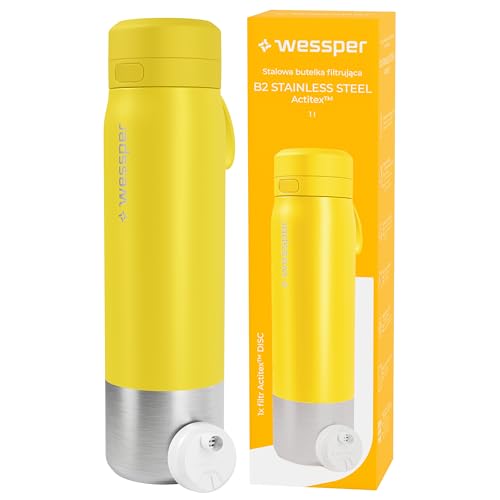 Wessper Gourde Filtrante, Bouteille d'eau en Acier Inoxydable avec Filtre Actitex Disc, 1 l, Filtre a Eau à Charbon, Réduit le Chlore, BPA FREE -Jaune