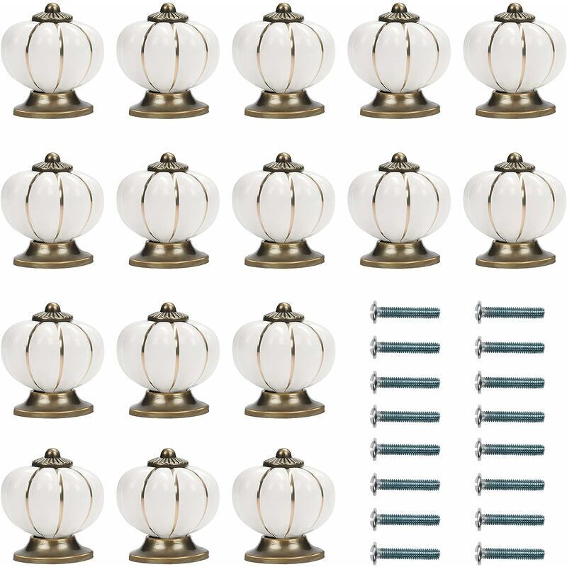 Bouton Ceramique Meuble Blanc et Or avec Vis en Forme de Citrouille (Lot de 16) - 3,6 x 3,9 cm - Bouton de Meuble Rond Vintage - Pour Maison, Bureau,