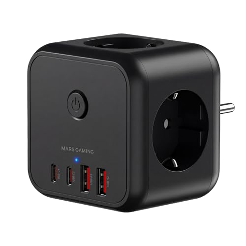 Mars Gaming MD-CUBE20, Powercube Multifonction Compact, 3X Prises SCHUKO + 2X USB-C + 2X USB-A, Charge Rapide PD 20W, Technologie GaN, Bouton on/Off avec Indicateur LED, 9 Protections, Noir