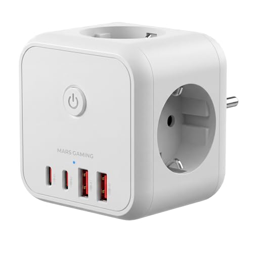 Mars Gaming MD-CUBE20, Powercube Multifonction Compact, 3X Prises SCHUKO + 2X USB-C + 2X USB-A, Charge Rapide PD 20W, Technologie GaN, Bouton on/Off avec Indicateur LED, 9 Protections, Blanc