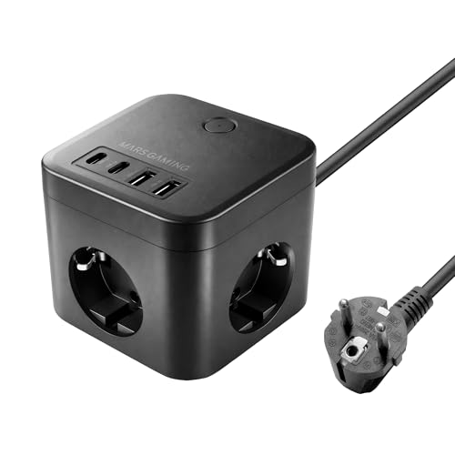 Mars Gaming MD-CUBE35, Powercube Multifonction Compact, 3X Prises SCHUKO + 2X USB-C + 2X USB-A, Charge Rapide PD 35W, Technologie GaN, Câble 1.8m, Bouton on/Off et Indicateur LED, 9 Protections, Noir