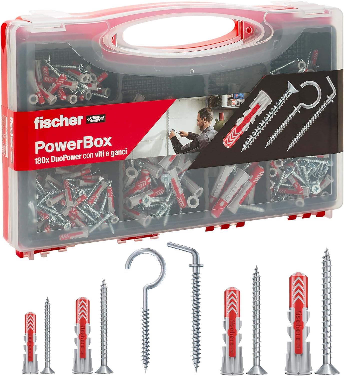 Fischer PowerBox 564282 Lot de 180 chevilles DuoPower avec vis et crochets pour mur plein, perforé et cloison sèche, 360 pièces au total,