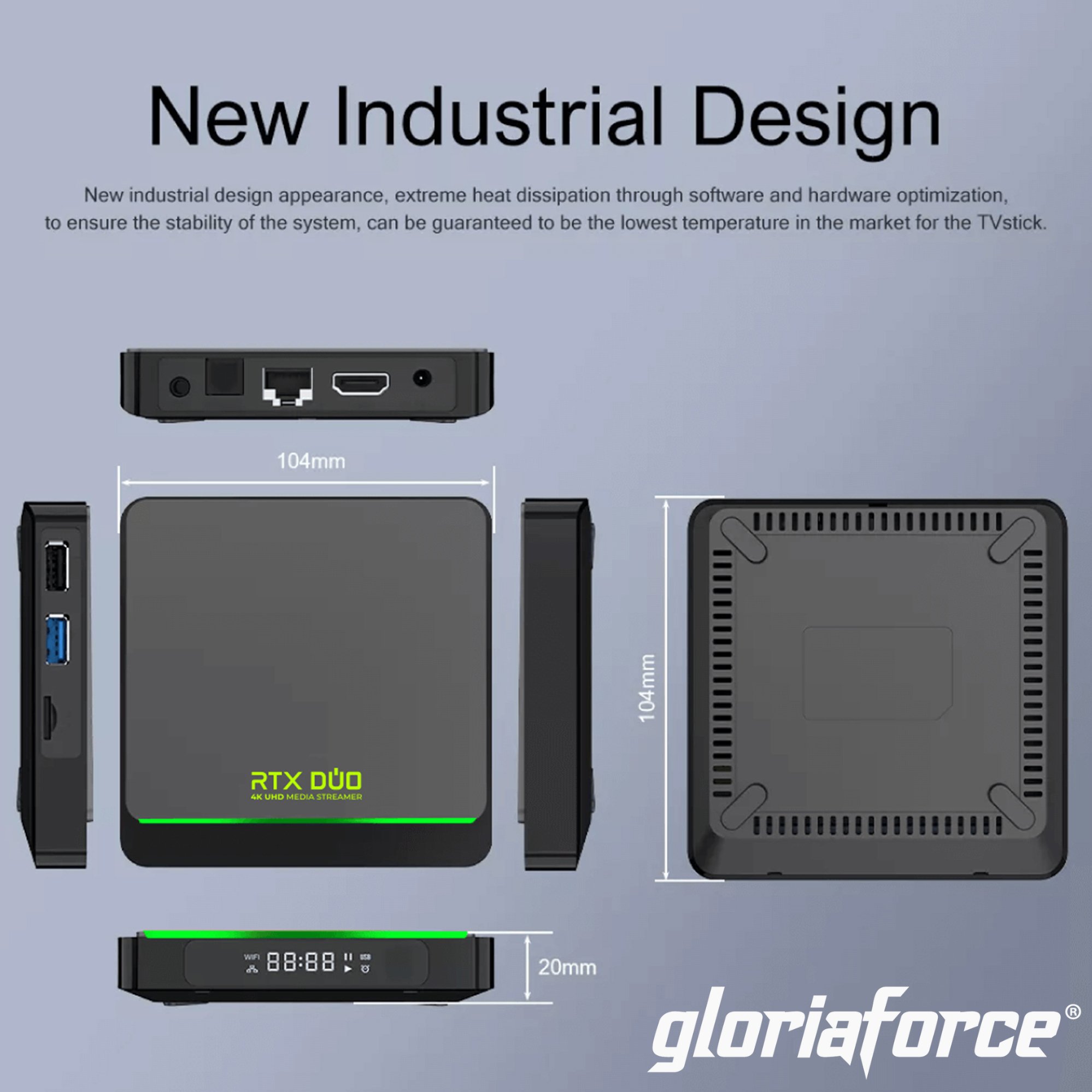 GloriaForce RTX Duo 4K UHD Android 11.0 TV Box 4 Go de RAM, 64 Go de mémoire Flash, 1 Gbit/s LAN, 5G WLAN, App Force II, Quad Core Arm Cortex A55, Arm G31 GPU, télécommande BT, HTS e-com HDMI