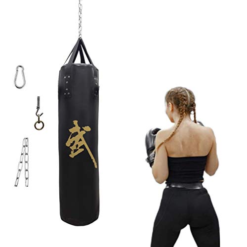 GORILLA SPORTS® Sac de Frappe - Rempli, avec Chaîne, 4 Mousquetons, Cuir, Acier, 27/37kg, 90cm/120cm, Ø 33cm, Noir - Articles d'Entraînement pour Boxe, Boxe Thai, Muay Thai, Sac Judo, Boxing Bag