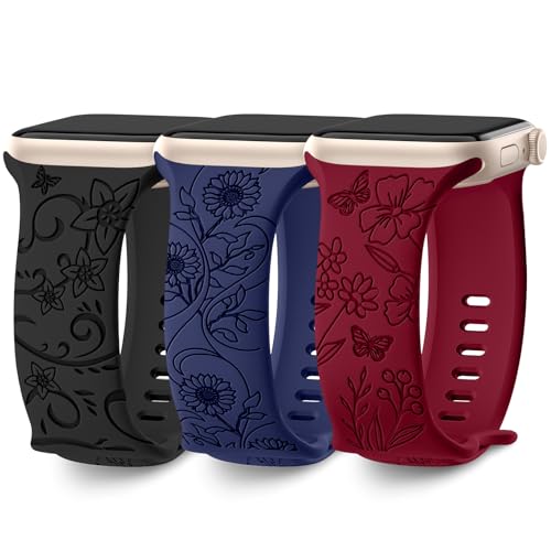 AMSKY 3 Pièces Floral Gravés Bracelets Compatible avec Bracelet Apple Watch 40mm 44mm 42mm 46mm 41mm 45mm 38mm 49mm Femme, Silicone Compatible avec iWatch Serie 11 10 9 8 7 6 5 4, SE 3 2 1