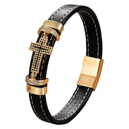 HUIANGLIYG Bracelet En Cuir Avec Croix Pour Homme Et Femme, Bijou Religieux Avec Fermoir Magnétique, Style Punk, Idéal Pour Les Fêtes, Couleur Or, 5, 23 Cm