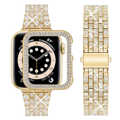 Wutwuk Compatible Bracelet Apple Watch 44mm, Bling Métal Femme Brillant Bracelet de Montre avec Protective Coque, Remplacement de Bracelet avec Strass Diamant pour iWatch SE3/2/1 Séries 6 5 4, Or 44mm