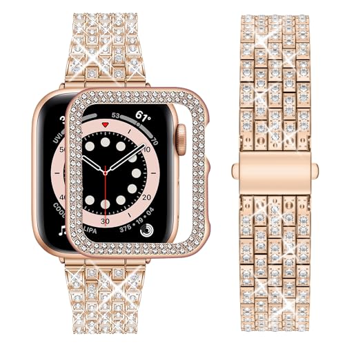 wutwuk Compatible Bracelet Apple Watch 44mm Bling Métal Femme Brillant Bracelet de Montre avec Bling Coque Remplacement de Bracelet avec Strass Diamant pour iWatch SE3/2/1 Séries 6 5 4, Or Rose 44mm