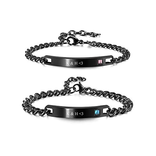 JSDDE Bracelet Couple Amoureux Personnalisé Prénoms Initiales en Acier Inoxydable Bracelet Plaque Gravure Texte Date à Chaîne Regolabile Personnalisable Connecté Distance Fiancés (Noir avec Strass)