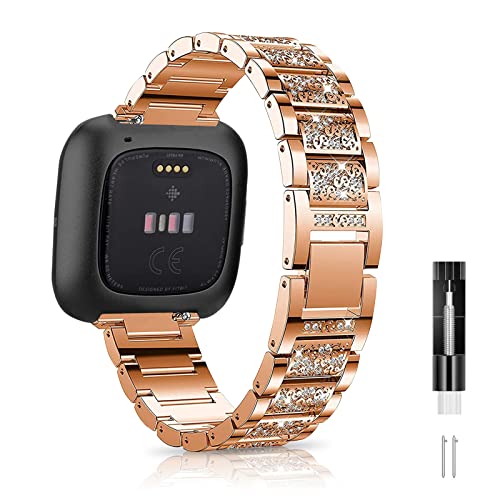 Niboow Bracelet Compatible avec Fitbit Versa/Fitbit Versa 2/Versa Lite, Acier Inoxydable Diamant Cristal Strass Strap, Femmes Bling Remplacement Bracelet pour Fitbit Versa/Versa 2/Versa Lite-Or Rose
