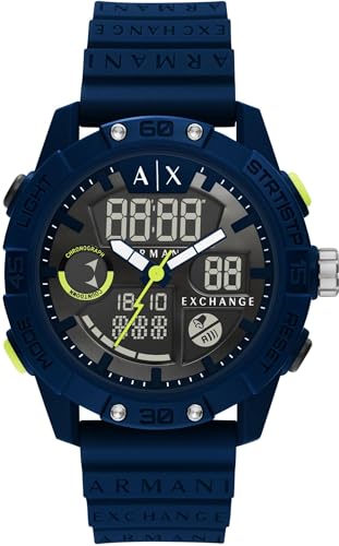 Armani Exchange montre pour homme, mouvement Ana-Digi et boîtier de 46 mm avec bracelet en acier inoxydable, en cuir ou en silicone, Bleu foncé et gris, 46MM
