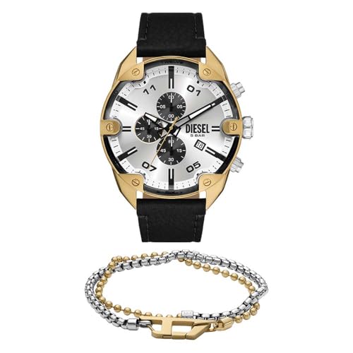 Diesel Homme Master Chief Noir Cuir Montre and Argenté Acier Inoxydable Bracelet, Coffret