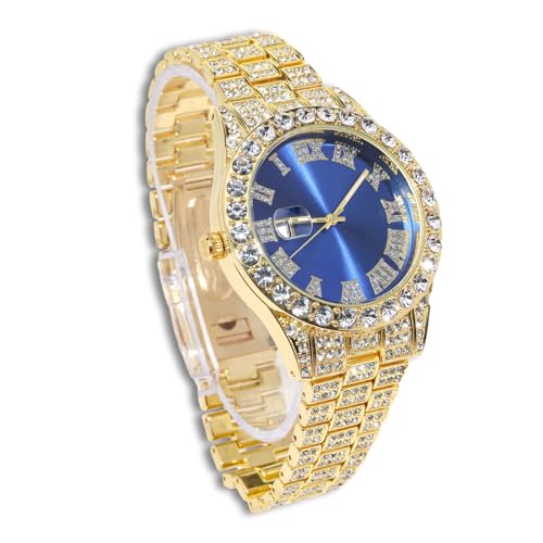 genkigold Montre en Diamants pour Homme – Cadran Rond 40mm Chiffres Romains en Bleue – Plaqué Or Véritable 18K Bracelet 22cm – Quartz Japonais – Bijou de Luxe