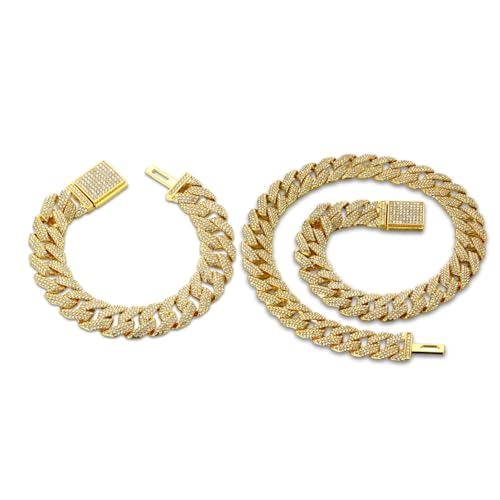 HALUKAKAH Chaîne Homme Diamant Or, Plaqué Or 18k Full Iced Out 15MM Chaîne Miami à Maillons Cubains Ensemble Collier & Bracelet, Diamants de Laboratoire Sertis Griffe, Cadeau pour Mari, Ami, Fils