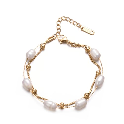 Bracelet femme original avec perle blanche. Bracelet en acier chirurgical plaqué or / argent pour femme, fille, idéal pour un cadeau de fête des mères, un anniversaire. Bijoux femme (Plaqué or)