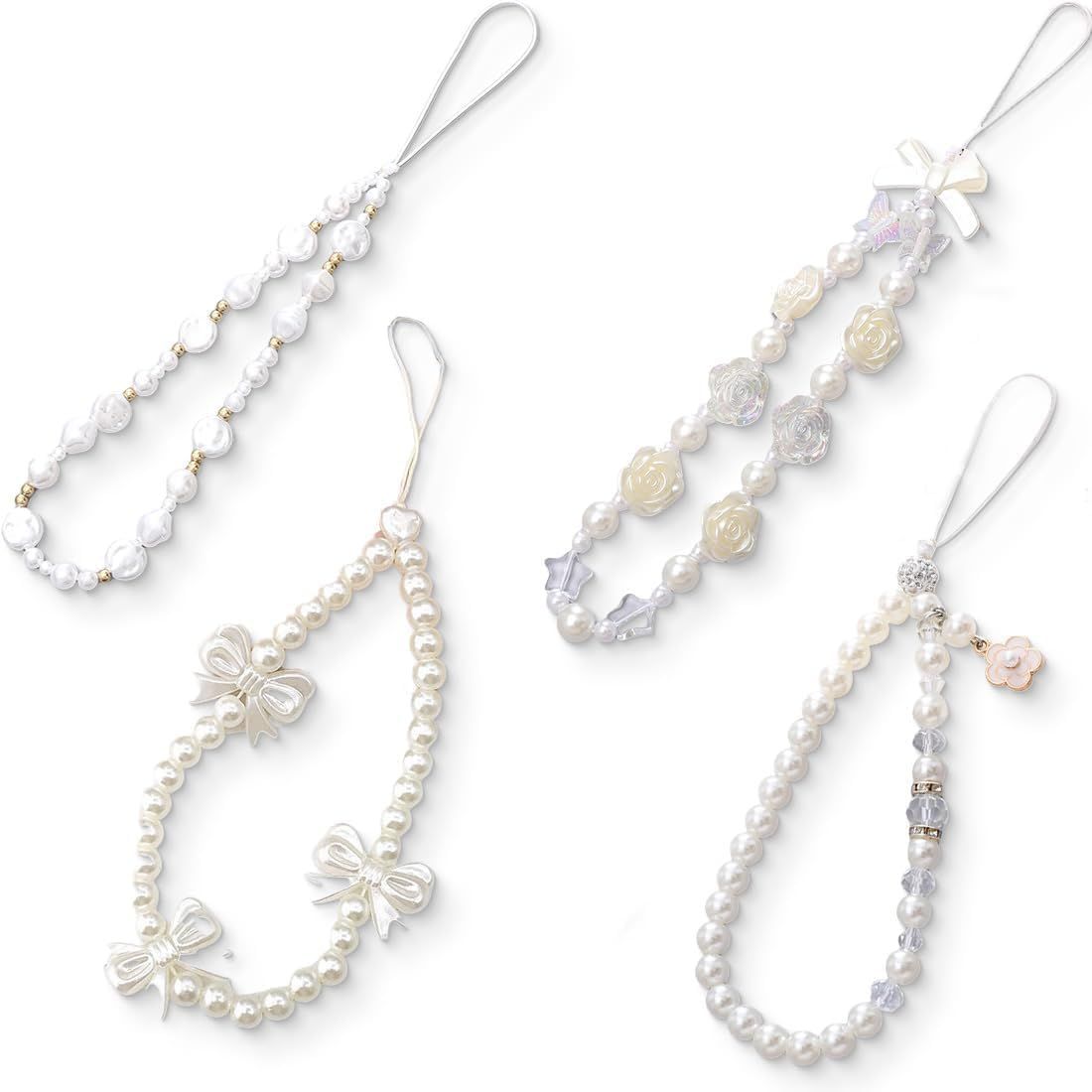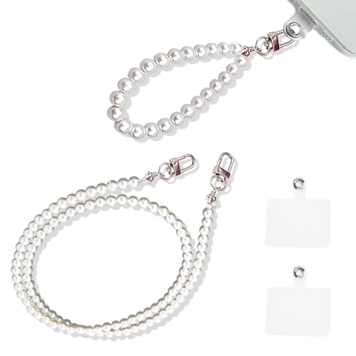 LURNODY 2 Pièces Dragonne Perlée Collier pour Telephone Portable Bracelet Telephone, Petits Pendentifs pour Décorer Téléphones Portables, Sacs Et Clés (Perles Blanches, Entretoises Incluses)