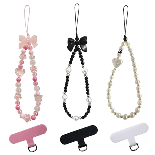 arrderly Lot de 3 Dragonne de Téléphone en Perles, Chaine Telephone Portable, Bracelet Telephone, Dragonne de Téléphone Portable Perlée pour Femmes Filles avec 3 Patchs Universels