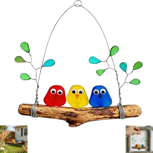 Perchoir coloré en verre de mer - Oiseaux en verre de mer sur branche - Décoration murale en bois flotté - Pour la maison, le balcon et les amoureux de la nature (3 oiseaux)