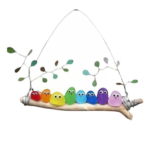 Perchoir coloré en verre de mer - Oiseaux en verre de mer sur branche - Décoration murale en bois flotté - Pour la maison, le balcon et les amoureux de la nature (8 oiseaux)