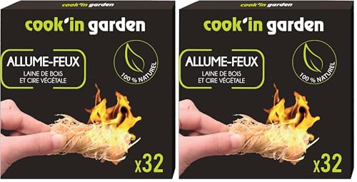 Cook’in Garden - Allume-Feu, Boîte 32 Cubes en Laine de Bois FSC® 100%, sans Odeur et Inodore, Allumage Facile pour Barbecue, Brasero, Poêle ou Cheminée, Utilisation Extérieure (Lot de 2)