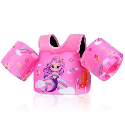MoKo Gilet de Bain Enfant, Brassard de Natation de Dessin Animé avec Boucle en D et Sifflet d'urgence, Équipement de Natation pour Petits Filles Garçons, (20-30-40-50 lbs), Sirène Rose